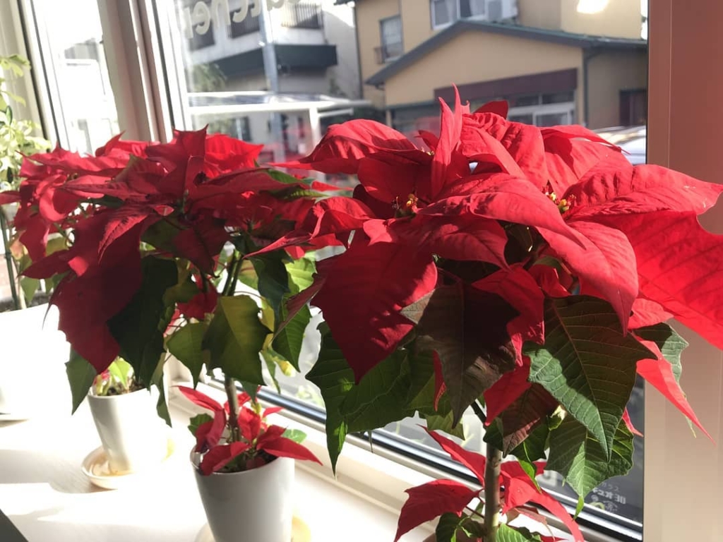 ポインセチアで皆様をお出迎えです。